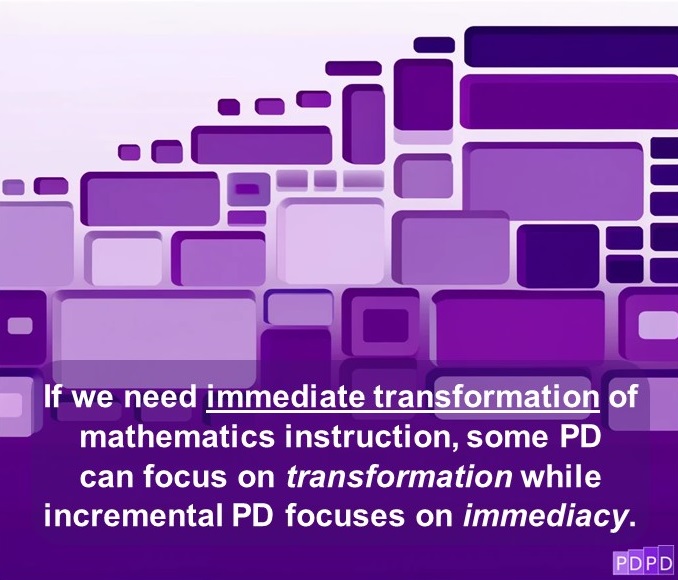 In our view, most PD efforts in mathematics education have been of the transformational variety. We are not the first to notice this trend, nor the first to call for incremental approaches. Goldsmith and colleagues (2014) pointed out that, when research has looked in detail at teachers’ learning from PD, it seems to be incremental: